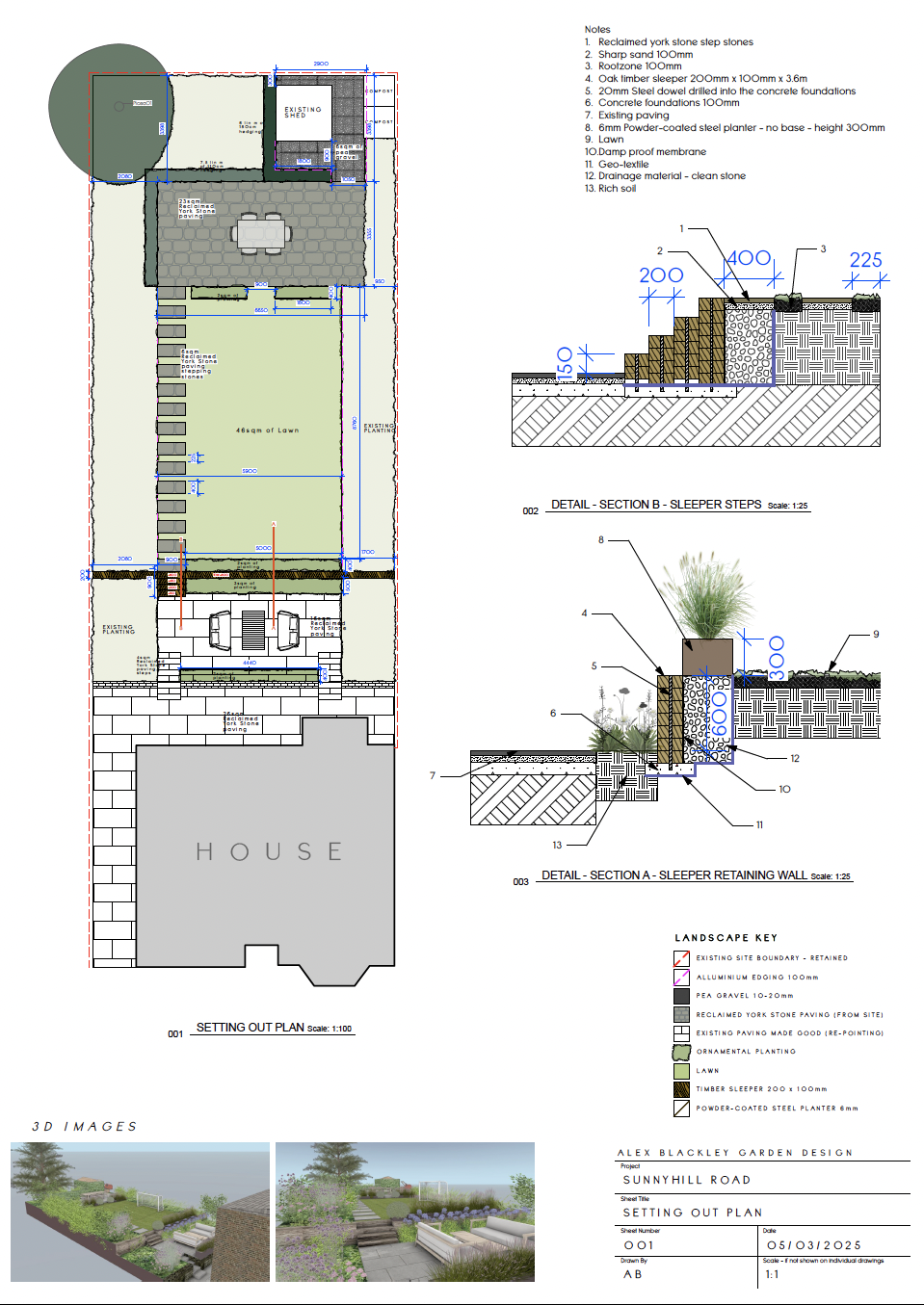 This is a project that’s currently in construction, the existing garden had a huge sloped lawn and we really wanted to try and level it out. The existing paving was yorkstone which I was really keen to keep and re-purpose to make a new raised terrace at the back of the house.